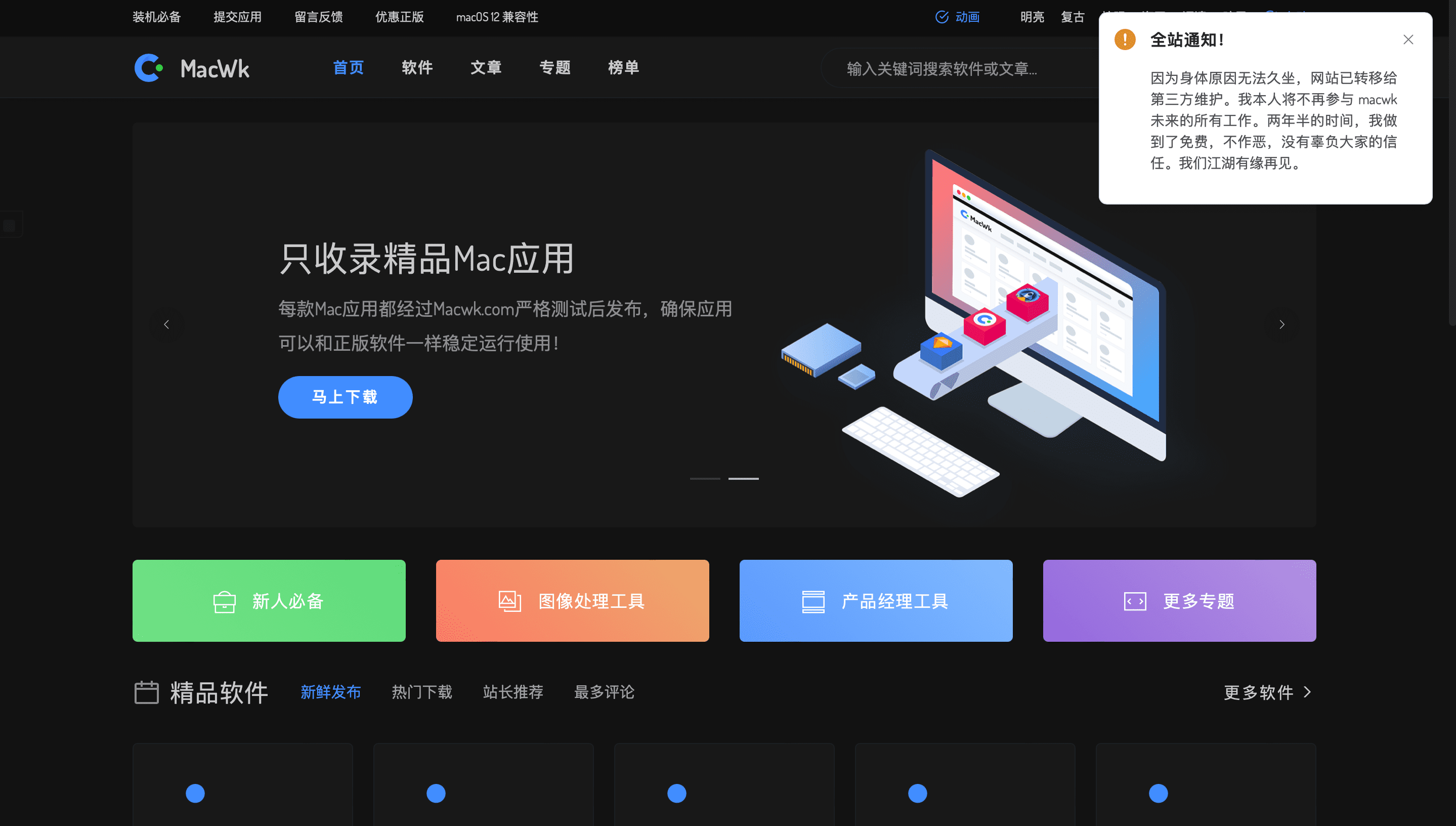 macwk管理员也就是阿肥昨天来找到我,说macwk的老板不高兴,原因竟然是我们网站上的一句话。“主要是因为自从macwk老站长也就是pertim走后,许多地方都做得比原来差了。”可是,麻烦各位在2022年前就已经开始使用macwk网站的小伙伴告诉他,我这句话说没说错。macwk之前是pertim一手创办的,现在大家看到的macwk的网站页面,和macwk的安装程序,也都是pertim自己写的。请各位小伙伴们想想,你已经在群里看到多少次有小伙伴来问,“为什么xxx软件网站上写着汉化版,可下载下来却没有汉化”;有多少次小伙伴来问,“为什么xxx软件在macwk上写着激活码,而安装包内没有激活码”等等诸如此类的问题。这些问题,在pertim管理网站的时候,有出现过吗?而又有多少小伙伴反馈都找不到地方反馈的?这些难道都不是问题吗?我说的难听一点,自从第三方开始接手macwk后,我就有心理预期,可能会比pertim做的差,但是我没有想到的是,居然现在macwk连马克喵之类的网站都比不过,这还是之前pertim的macwk吗?有人会问,为什么pertim突然转手给第三方了,很多小伙伴都知道,但是也有很多小伙伴不知道,所以今天做一个统一的回复,pertim因为身体原因,更准确地说是生病了,所以才忍痛割爱,将macwk转手给了第三方,可现如今的macwk是怎样的?不知道pertim身体好后回来看到现如今的macwk会作何感想。