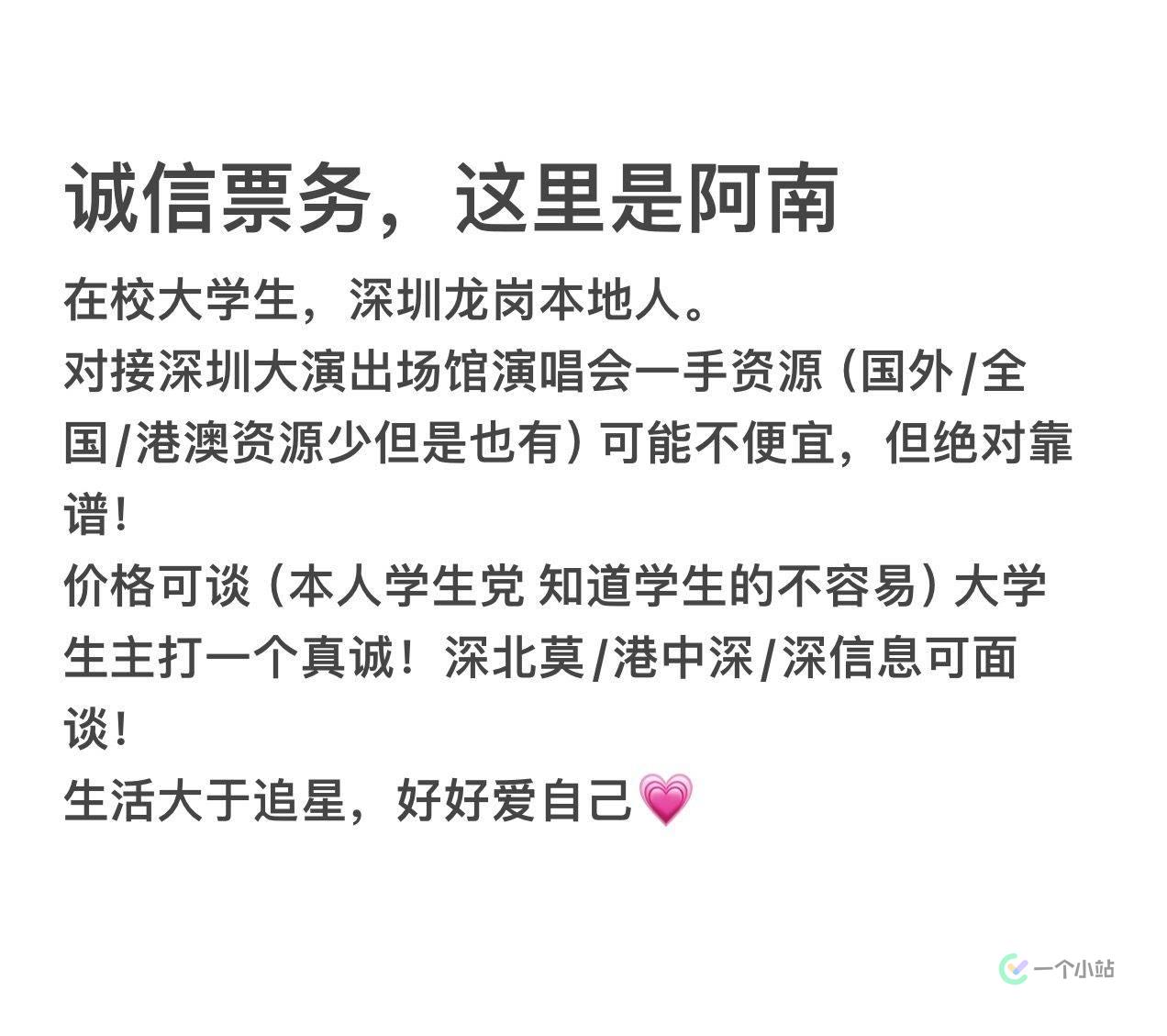 Hi,大家好,这里是阿南。自我介绍一下——深北莫在校大学生,深圳龙岗本地人。对接深圳大演出场馆演唱会一手资源(国外/全国/粤港澳资源也有)