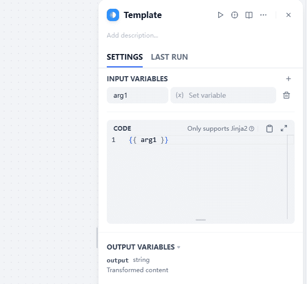那么,如何构建特定类型的变量呢?最简单的办法是使用「模板转换」节点。这一节点接受任意类型变量的输入,且会强制把所有输入变量转换为string类型输出。