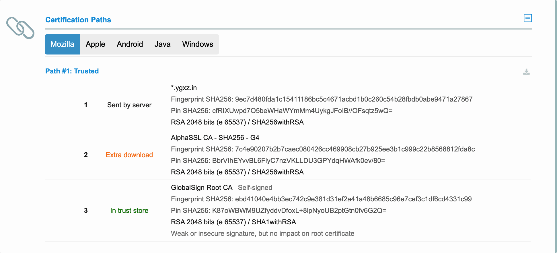 - 根证书由 CA 机构颁发,例如,本站使用的证书中,CA机构则为 GlobalSign 。