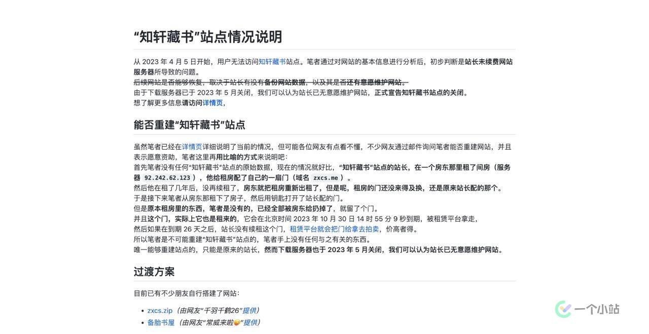 在知轩藏书关站以后,一位热心网友(即 zxcs.wiki 的站长)通过抢占被释放的 IP 的方式把情况说明挂在了知轩藏书的网站上,大致内容如下: